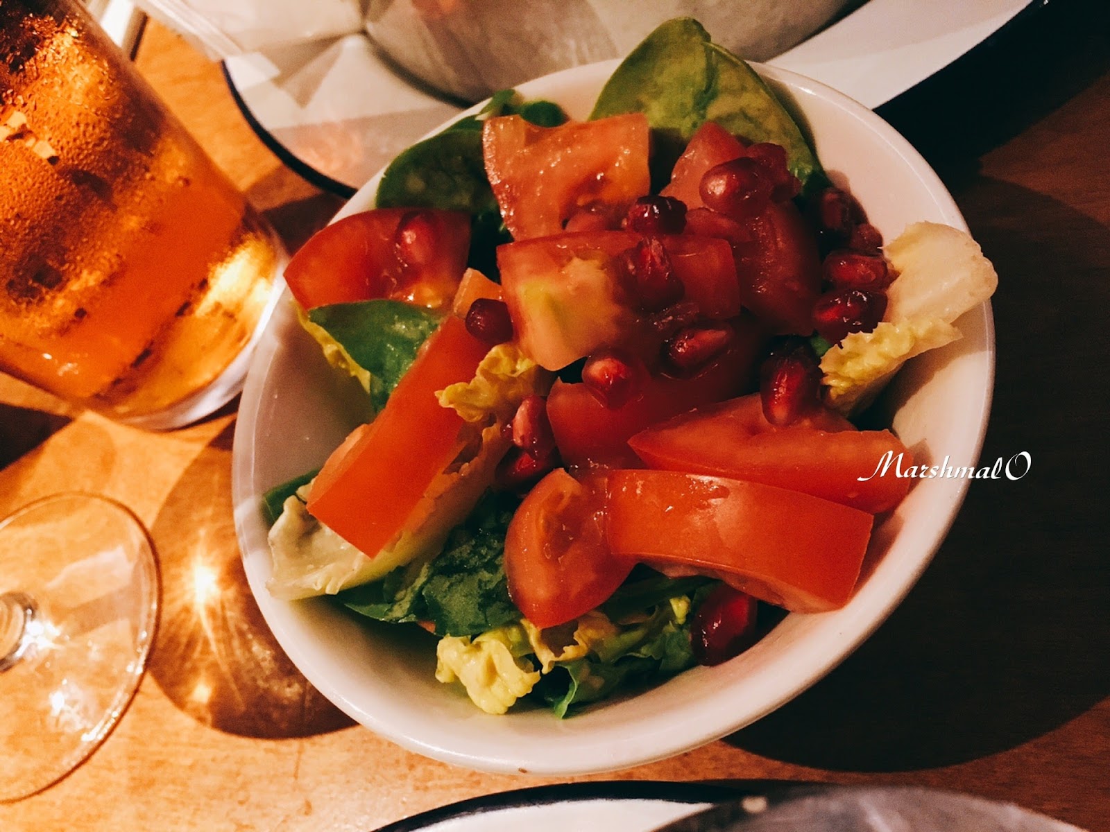 沙拉裡面有生菜、蕃茄、紅石榴,淋上一點點油醋醬。