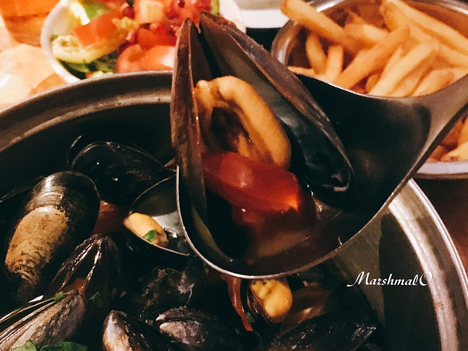 只要點淡菜就會附贈薯條、沙拉當配菜,薯條充滿牛油香氣,最適合搭配美乃滋了!這裡的美乃滋跟台灣吃到的口味不太一樣,加了一點萊姆,微酸解膩~超愛!