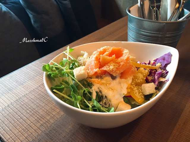 燻鮭魚沙拉佐香橙優格醬($250)份量適合2人共享,有兩大片燻鮭魚,以單點來說價位略高,但香橙優格醬清爽不膩的口感很令人喜愛。