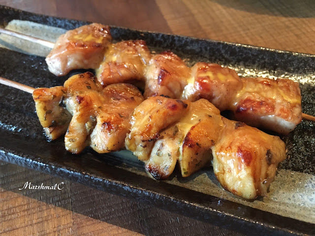 串燒拼盤($135)搭配啤酒最適合了,今天的串燒有豬肉雞肉各一串,豬肉可能有醃漬過,味道有點像德式香腸,有點奇妙;而雞肉則是口感Q嫩。