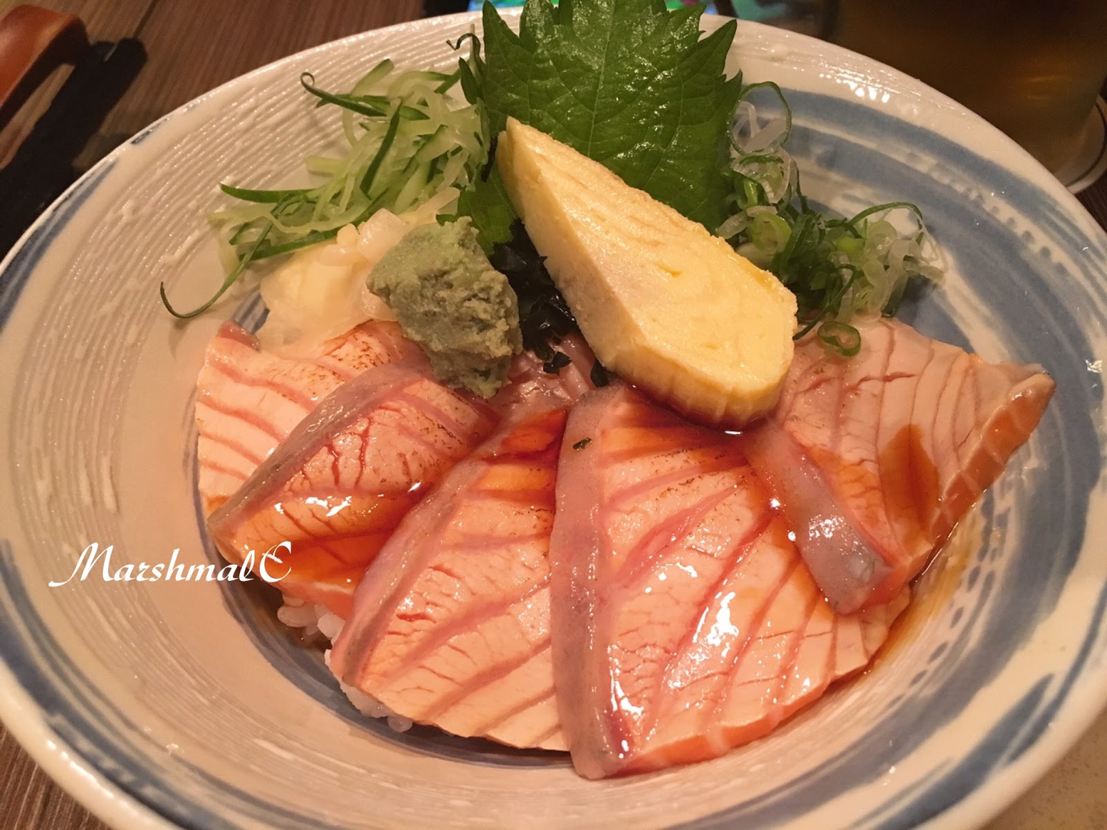炙燒鮭魚丼($300)。一般日本料理店的炙燒鮭魚大多利用噴槍烤到半生熟,以溫度帶出油脂,表面也會有點恰恰,口感則會多一點焦香。