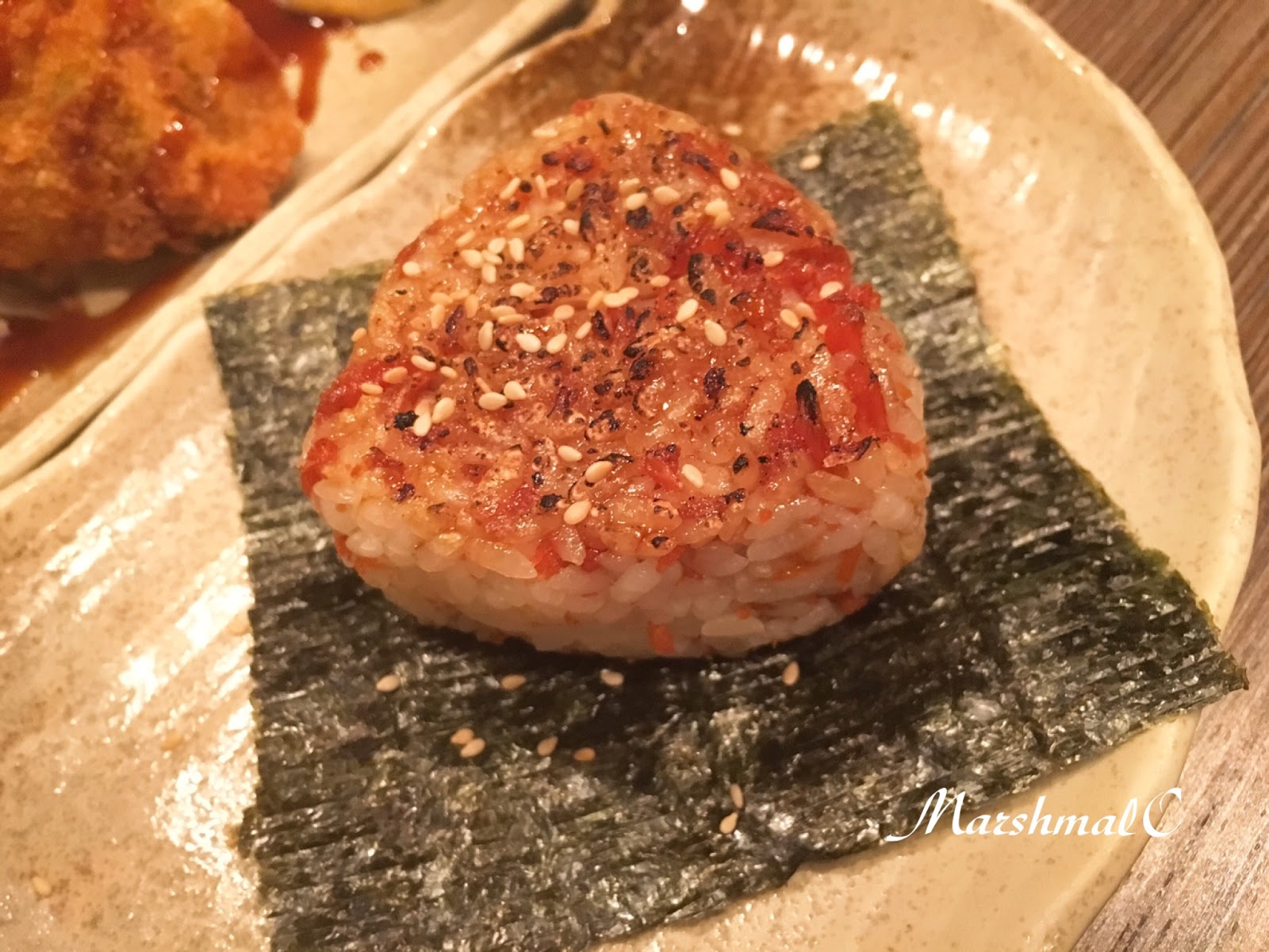 鮭魚烤飯團($60)其實是我最不期待的一道,我愛鮭魚生魚片,但卻很怕熟鮭魚的腥味,以前曾試過幾次日本料理店的飯糰,都吃一口就放棄,但好友品嚐了德朗的烤飯團後露出了極度誇張的美味表情,硬是塞了一口給我,不僅沒有腥味而且香氣十足,中午單點烤飯團來當午餐我都願意~(〃∀〃)~♡