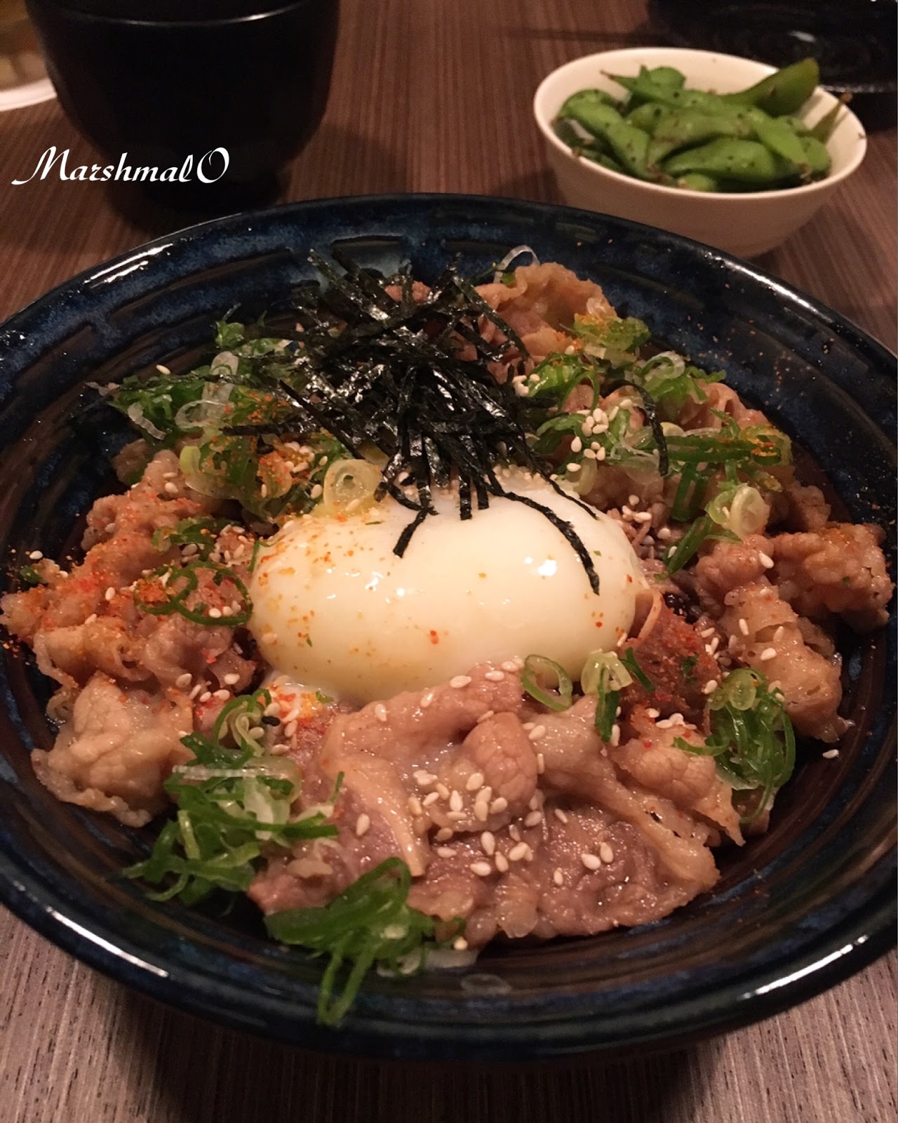 牛丼($180)豐富油脂的肉片口感相當軟嫩,拌上半熟的溫泉蛋更為美味。